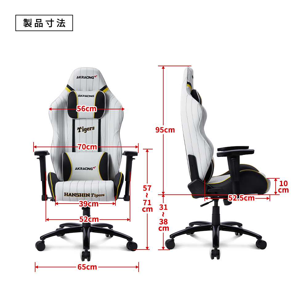 背もたれ中央にTigers ロゴ、座面部分に阪神タイガースチームロゴが刺繍加工で施されています。