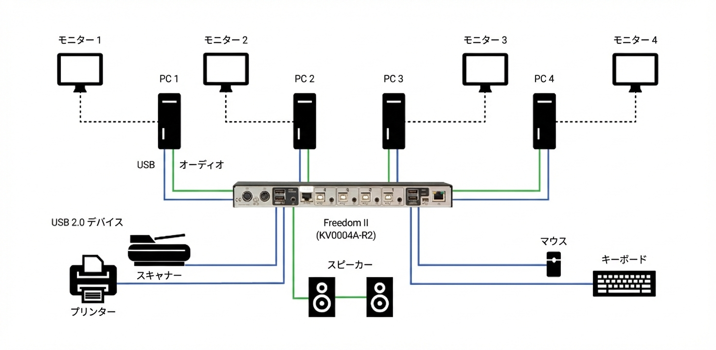 ServSwitch Freedom KVMスイッチ 4Pは、最大4台のPCを1組のUSBキーボード・マウスで操作できるKMスイッチです。