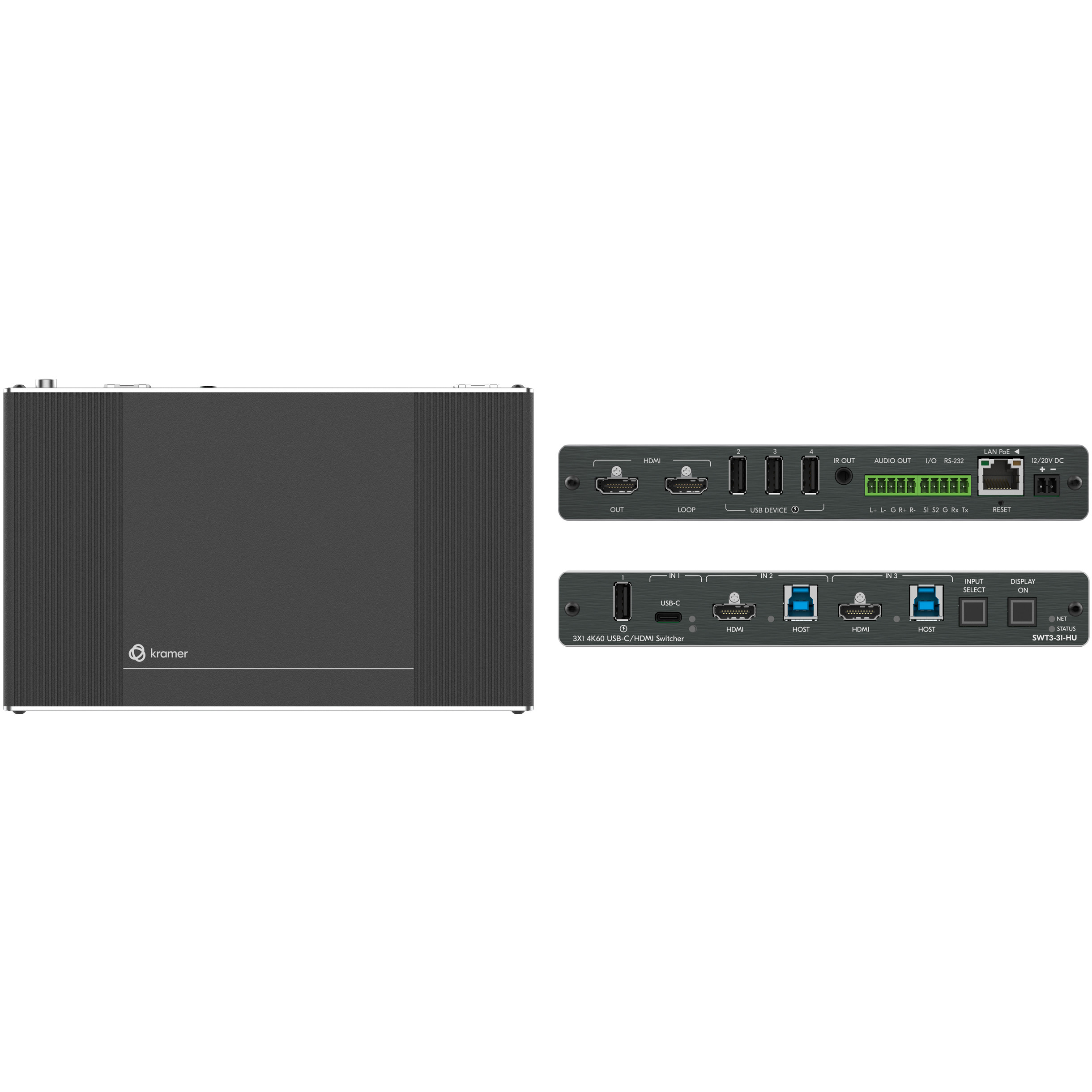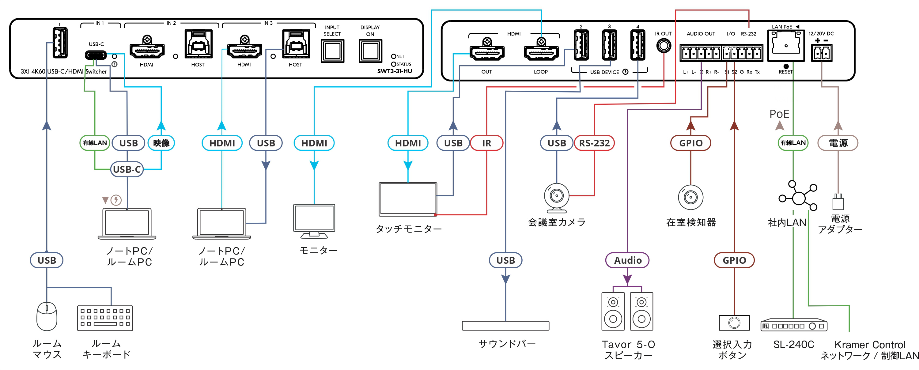 USB-C入力1系統と、HDMI+USB Host入力2系統を搭載した3x1構成により、持込ノートPCや常設Room PCなど複数ソースを柔軟に切替可能。 映像信号だけでなくUSBホストもあわせて切り替えられるため、ハイブリッド会議環境を効率よく構築できます。