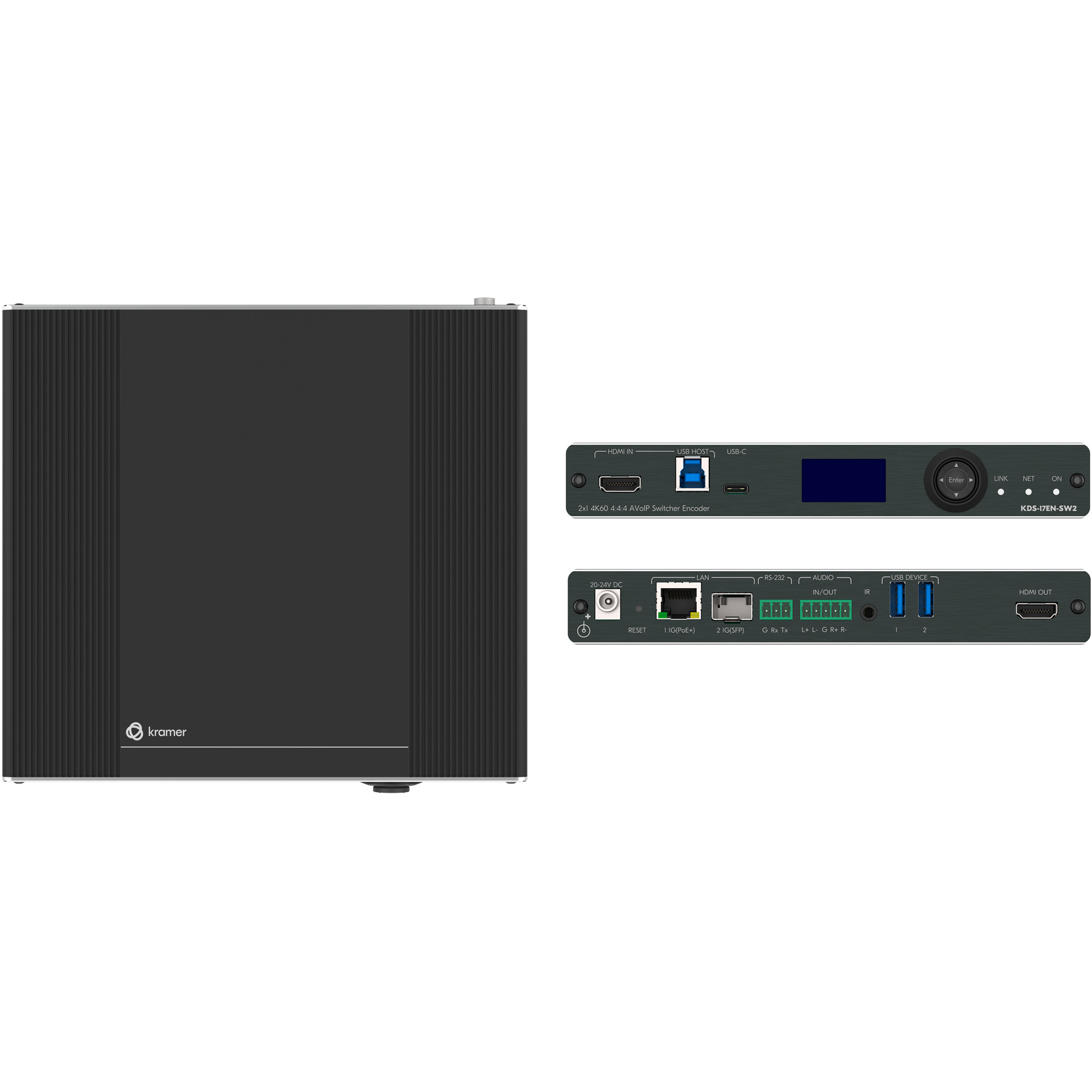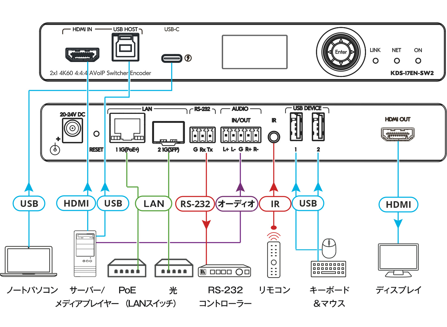 LAN 1はPoE+対応RJ-45、LAN 2はSFP接続に対応し、銅線LANと光配線の両方を活用可能。 設置場所の自由度を高めながら、長距離伝送やノイズ対策を意識したAV over IP構成に対応します。