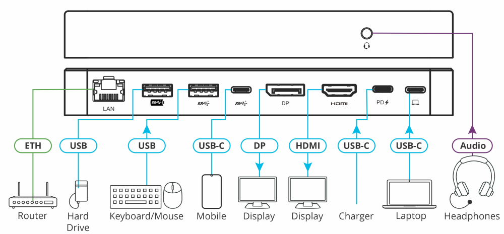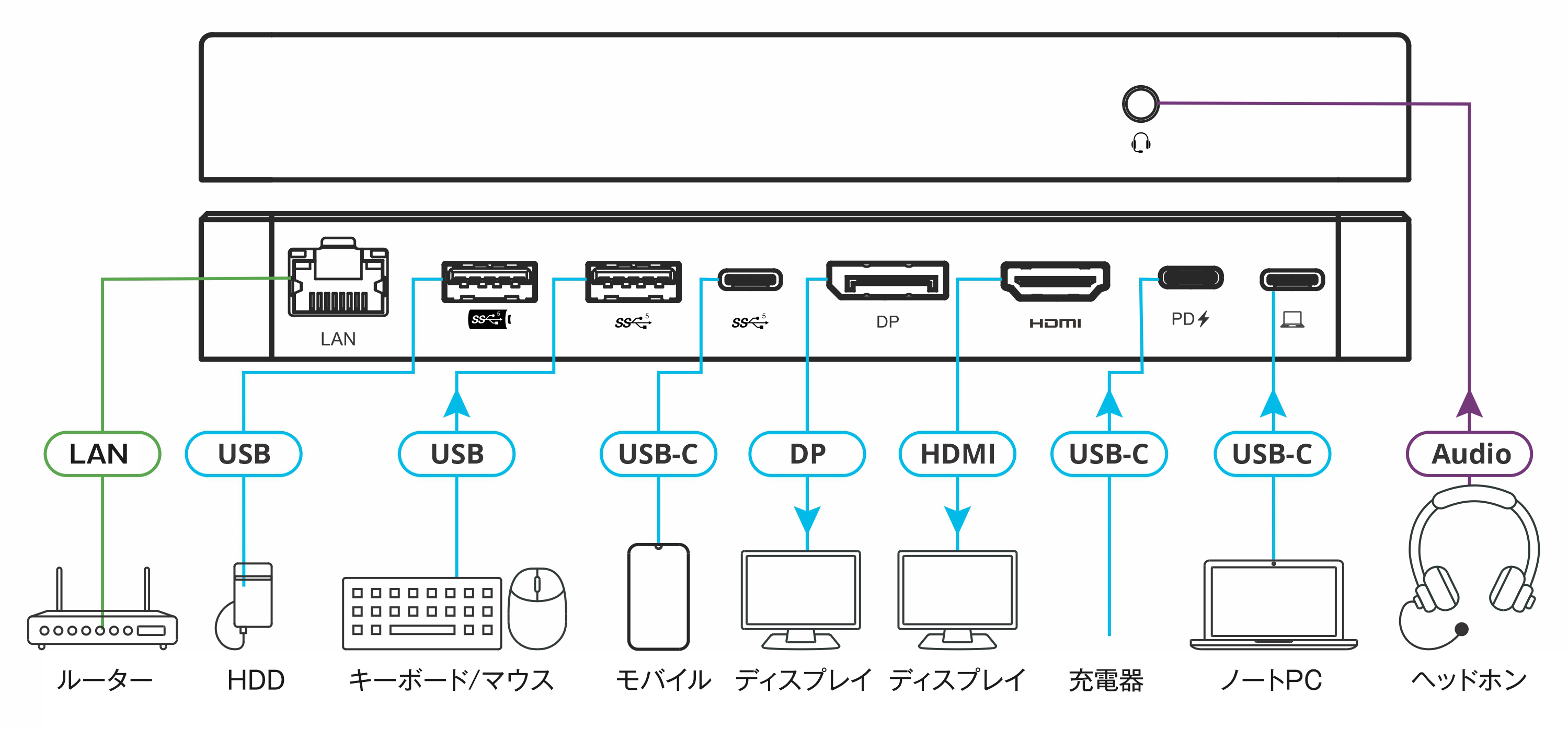 ディスプレイ・LAN・USB機器・給電をデスク側に集約。PCはUSB-Cを挿すだけで即業務開始できます。