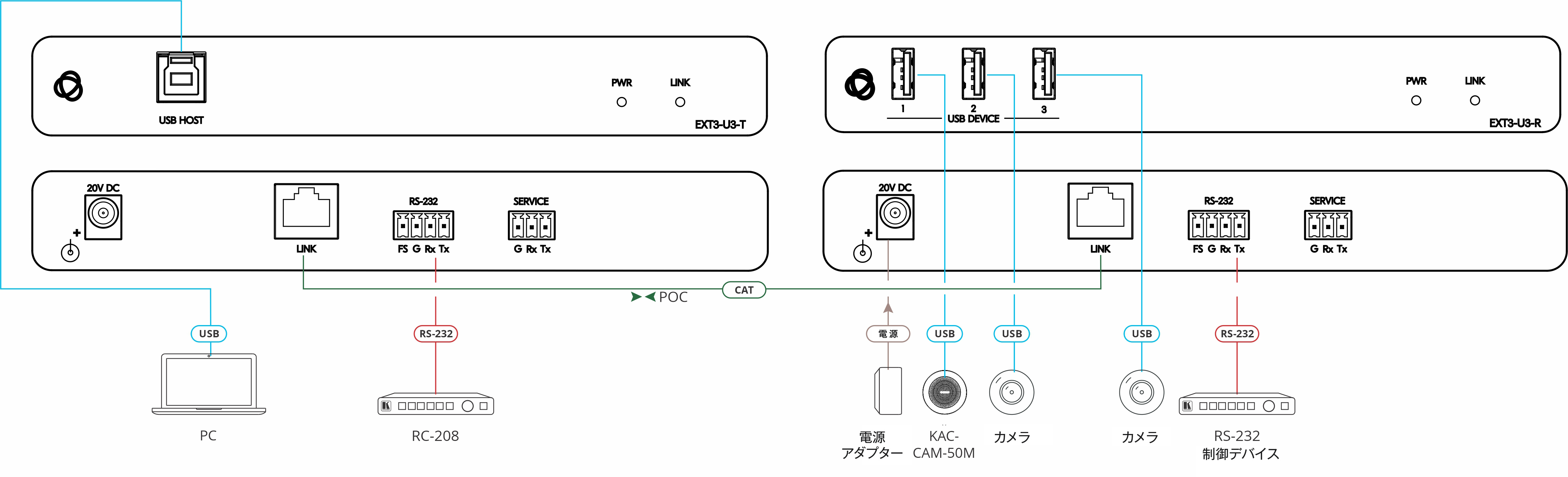 - USBカメラやスピーカーフォンなど消費電力の大きい機器を複数接続する場合は、安定動作のため受信器EXT3-U3-R側へローカル電源を接続する構成を推奨します。