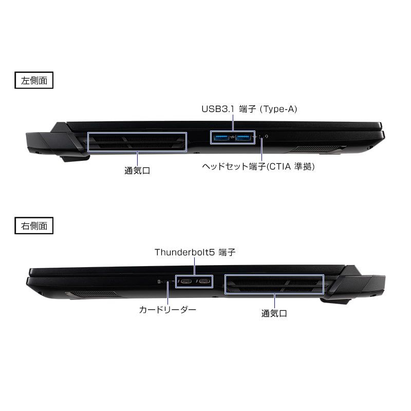 Thunderbolt 5を2基搭載(画面出力対応、USB PD入力対応)。高速ストレージやドック接続で持ち出しと据え置きの間で切替がしやすく、現場でのデータ取り回しや周辺機器拡張をスマートにできます。