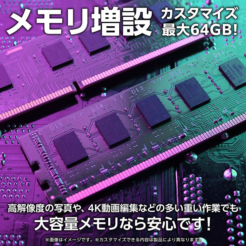 NVMe Gen4×4 SSD(500GB)とDDR5-5600メモリ(最大64GB)に対応。さらにM.2 SSDを2基搭載できる構成で、素材保存と書き出し先を分けるなど、制作のボトルネック低減に役立ちます。