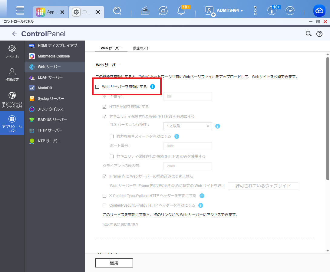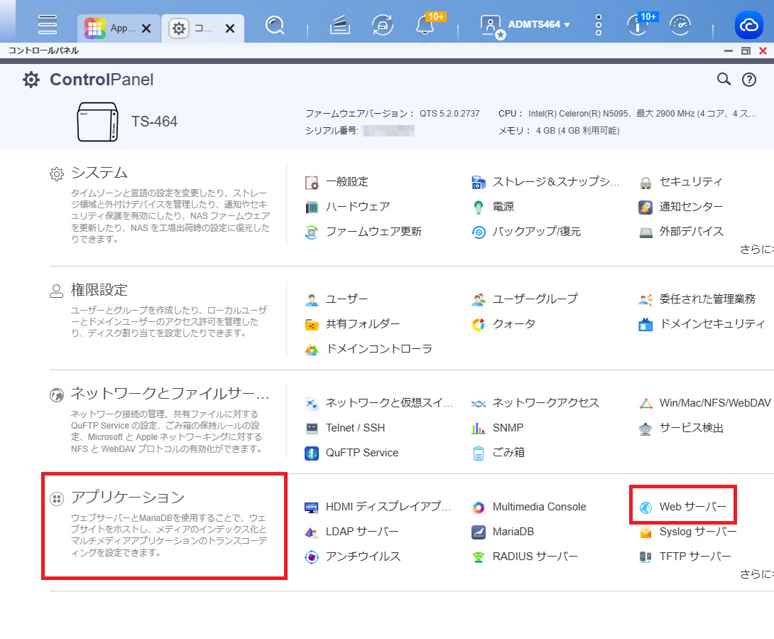 「コントロールパネル」「アプリケーション」「Webサーバー」と進み、Webサーバーの設定画面を呼び出します。
