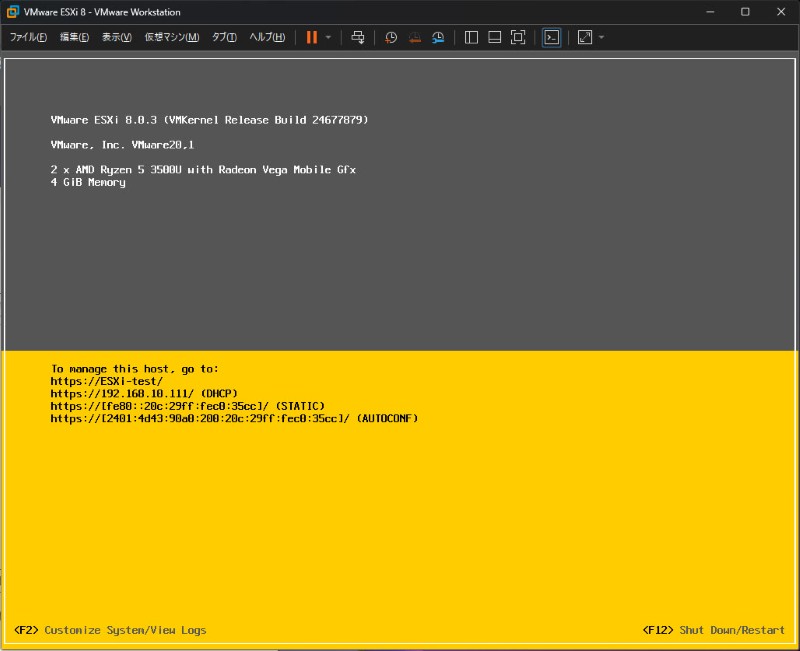 ここで入力するのは、ESXi上に構築した個別の仮想マシンのものではなく、ESXiのIPアドレス、ユーザー名、パスワードです。
