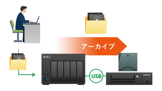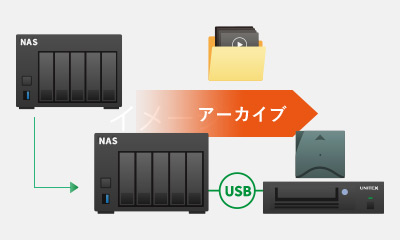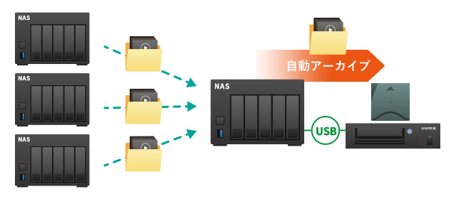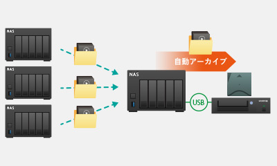 - 複数台存在するNASのデータを、LTOを接続した1台のNASで集約アーカイブ/統合管理が可能