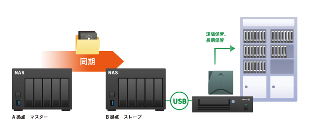 - マスター・スレーブ間で定期的に同期、スレーブNASからLTOへ自動アーカイブ