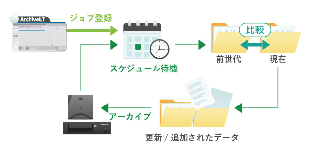 - 「インクリメンタルアーカイブ」機能を利用し、前回のアーカイブ時から追加/変更されたファイルのみを自動的にLTOへ書込み
