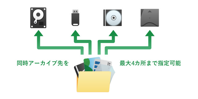 最大4つのアーカイブ先へ同時にアーカイブ可能。マスターメディアへのアーカイブとほぼ同時にバックアップメディアも作成可能。