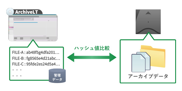アーカイブ時にハッシュ値を自動的に計算し、管理情報として保存。書き込み後に自動的にデータを再読み込みし、元データと比較(自動ベリファイ機能)。