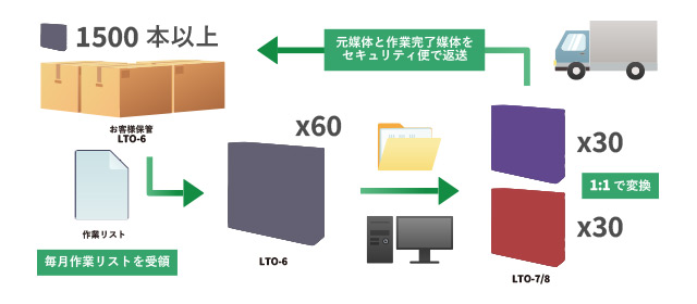 - 毎月60本のLTO-6テープをLTO-8テープに変換(年間720本/2年間作業)