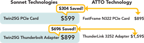 Sonnet は、Twin10G、Twin10G SFP28、Solo10G、Solo10G SFP+、Solo2.5G、AVB GbE などのクライアント ネットワーク アダプタの完全なラインナップも提供しており、PCIe カード、バスパワーThunderboltアダプタ、および/またはアップグレード可能な壁電源式Thunderboltアダプタで利用できます。ATTO は、バスパワーThunderboltアダプタ、2.5GbEアダプタ、AVB Ethernetアダプタ、アップグレード可能なThunderboltアダプタを提供していません。