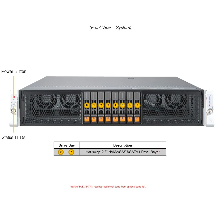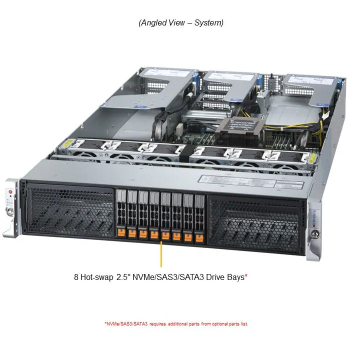 8 front hot-swap 2.5" NVMe*/SAS*/SATA* drive bays