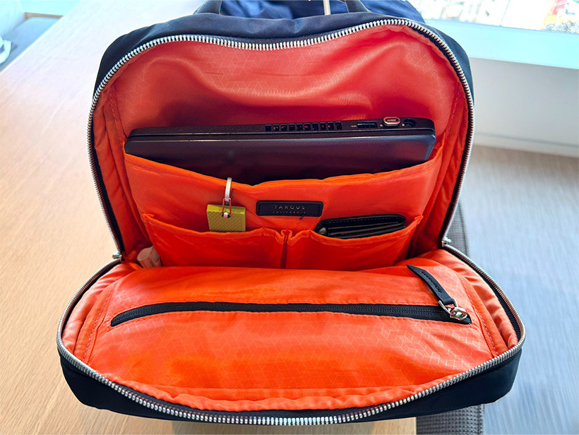 裏地のオレンジ色がバッグの中身を見つけやすく、デザインのアクセントとしても良好です。背中面の小ポケットに入退室用のカードを入れておくと、さっと取り出すのに便利でした。