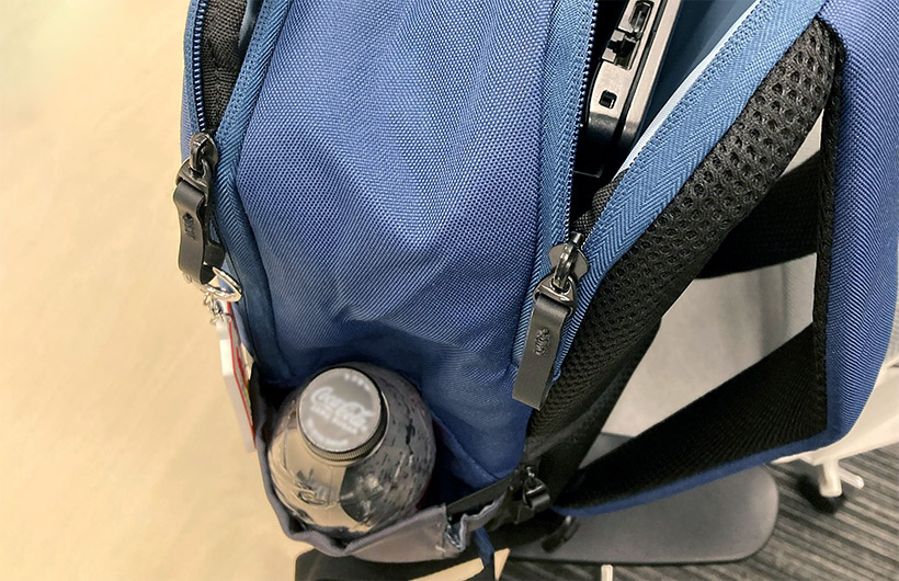 両側についているサイドポケットはすぐに取り出したい物を入れるのに便利で、片側にペットボトル、もう片側に日焼け止めスプレーやエコバック、マジックペンをセットしていました。 フロントポケットは応急薬や会社のスマホなど、念のために持っておきたいアイテムを入れるのにちょうど良かったです。