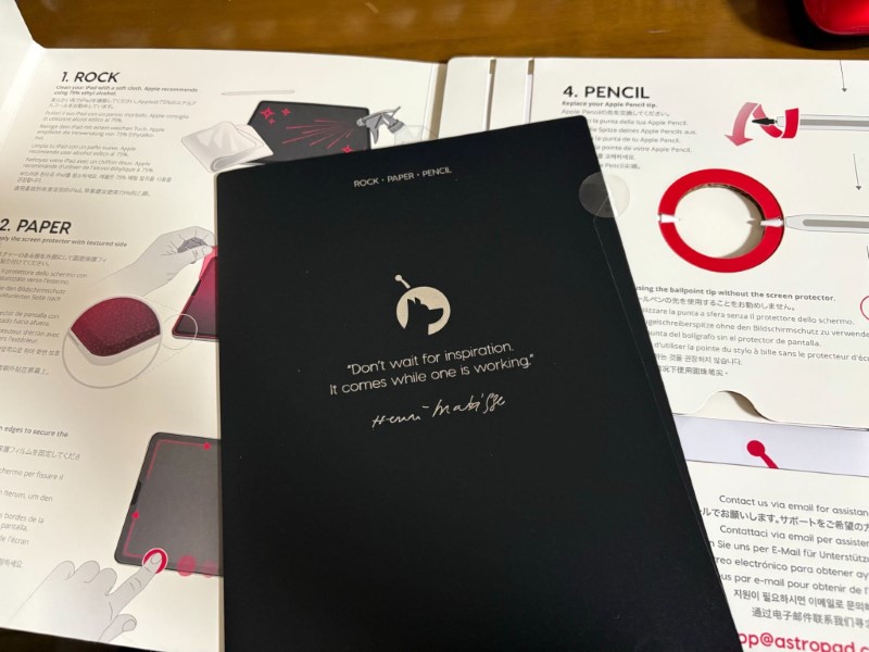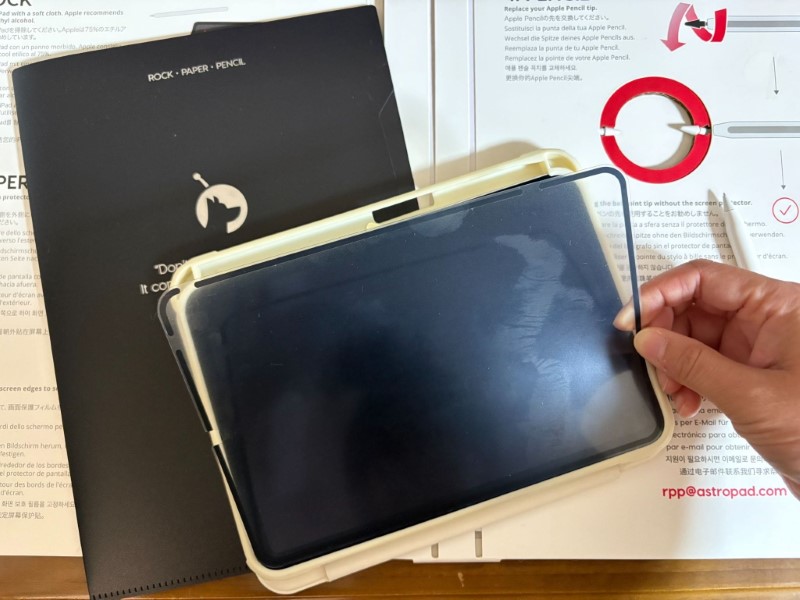 Rock Paper Pencilのスクリーンプロテクターはシール状ではなく、外周の黒いラインが磁石のようにくっつく仕組みで、ゲームや写真編集といった他の作業の際は外し、専用ファイルで保管できるのもありがたい点です。