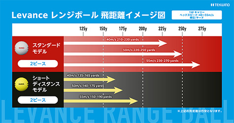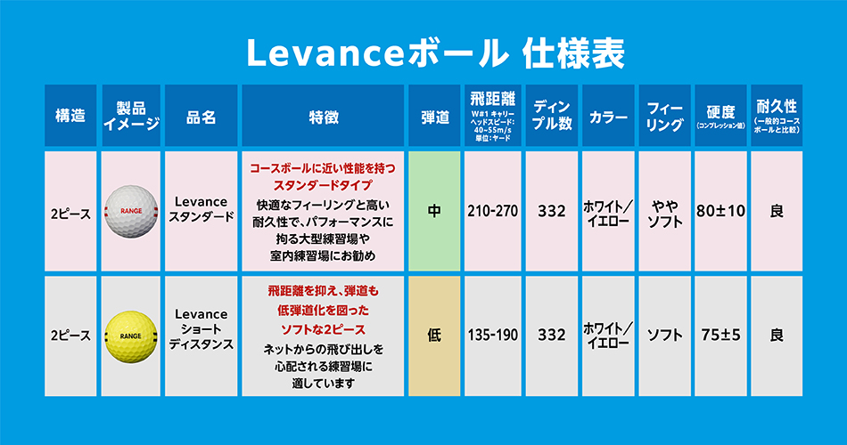 特長 | コースボールに近い飛距離性能。本コース感覚で練習できる環境をお求めの練習場にお勧めです。 | コースボール比で約3割減の飛距離性能を設定。オーバーネット事故対策を重視する練習場にお勧めです。 |