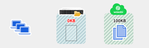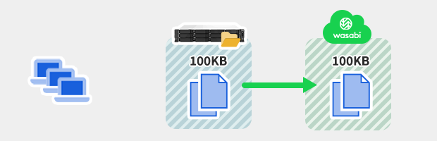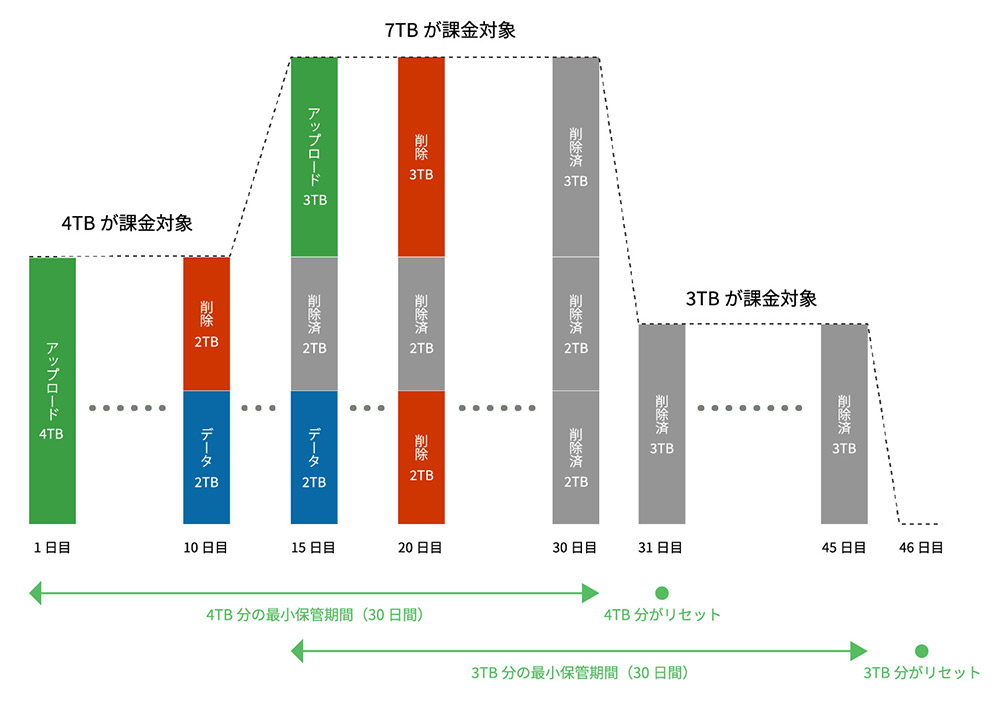 Wasabi Hot Cloud Storage では、課金対象となる容量は、保存されている実データに加え、消去したデータのうちアップロードから30日が経過していないデータも含まれます。
