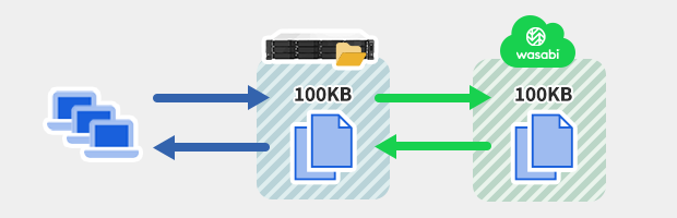 ファイルサーバー内のデータは、キャッシュ領域がいっぱいになると、低優先度のデータから削除されます。その際、ファイル名・サイズ・日付などのメタデータは残っているので、ユーザーからは全てのデータがファイルサーバー内に保存されているように見えます。メタデータにアクセスすると、クラウドストレージ上のデータを読み込みます。